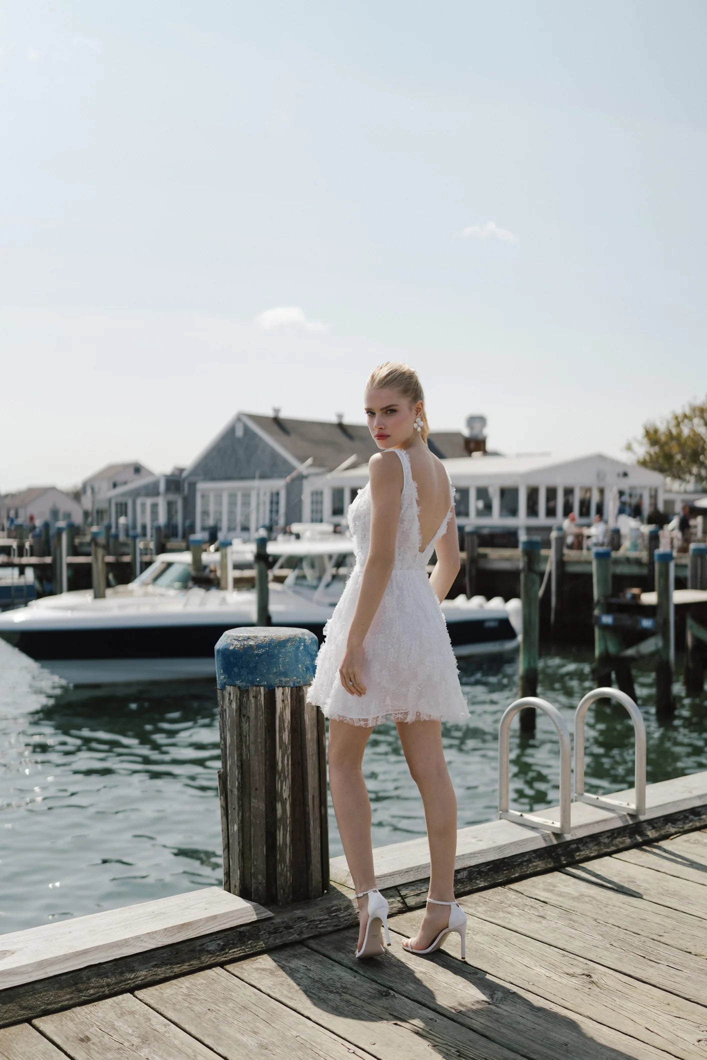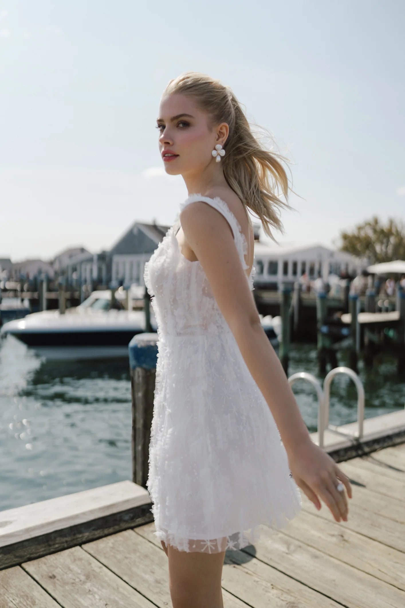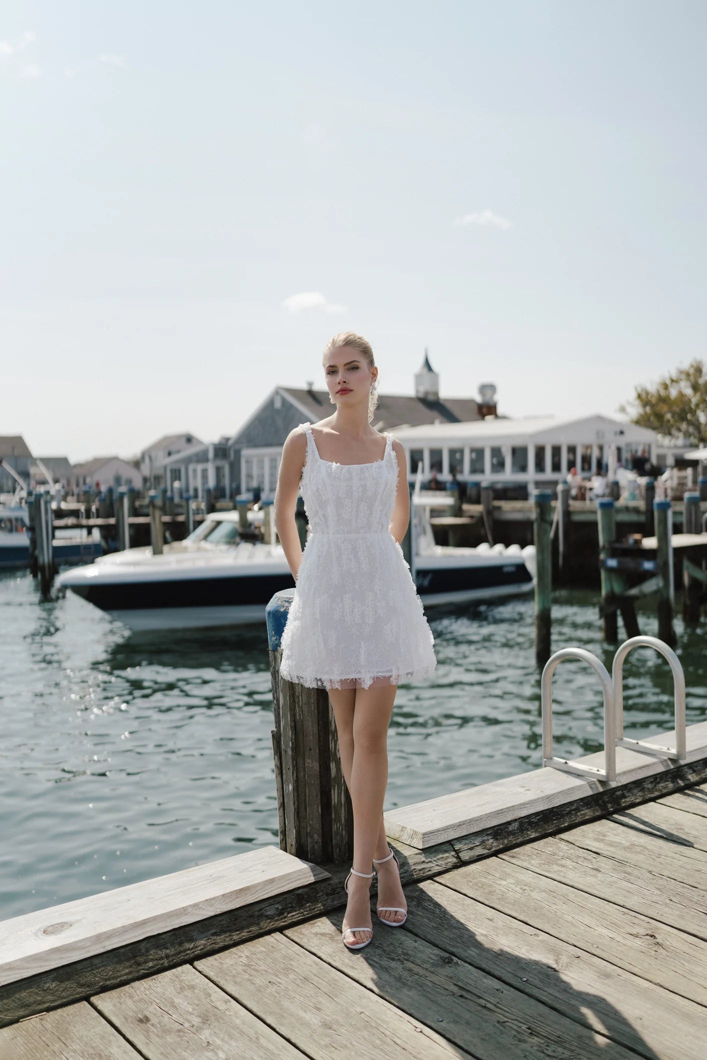 Square neck tulle mini dress with beaded embroidery accented with 3D pleated tulle
